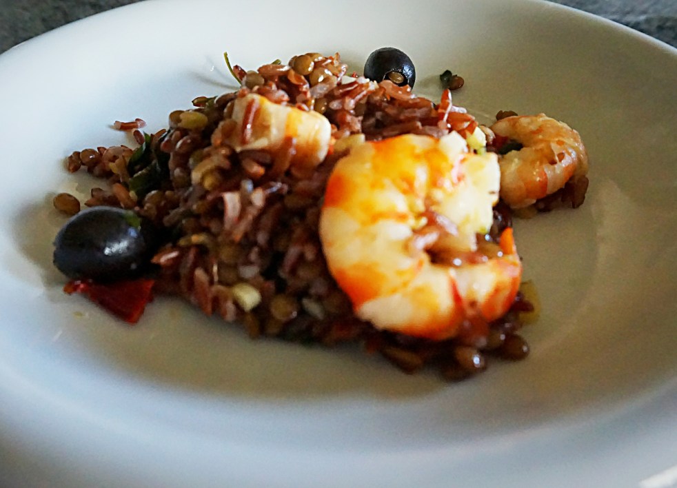 Riso rosso Thai con lenticchie, code di mazzancolle e olive nere. Un primo piatto speziato, salutare e naturalmente gluten free.